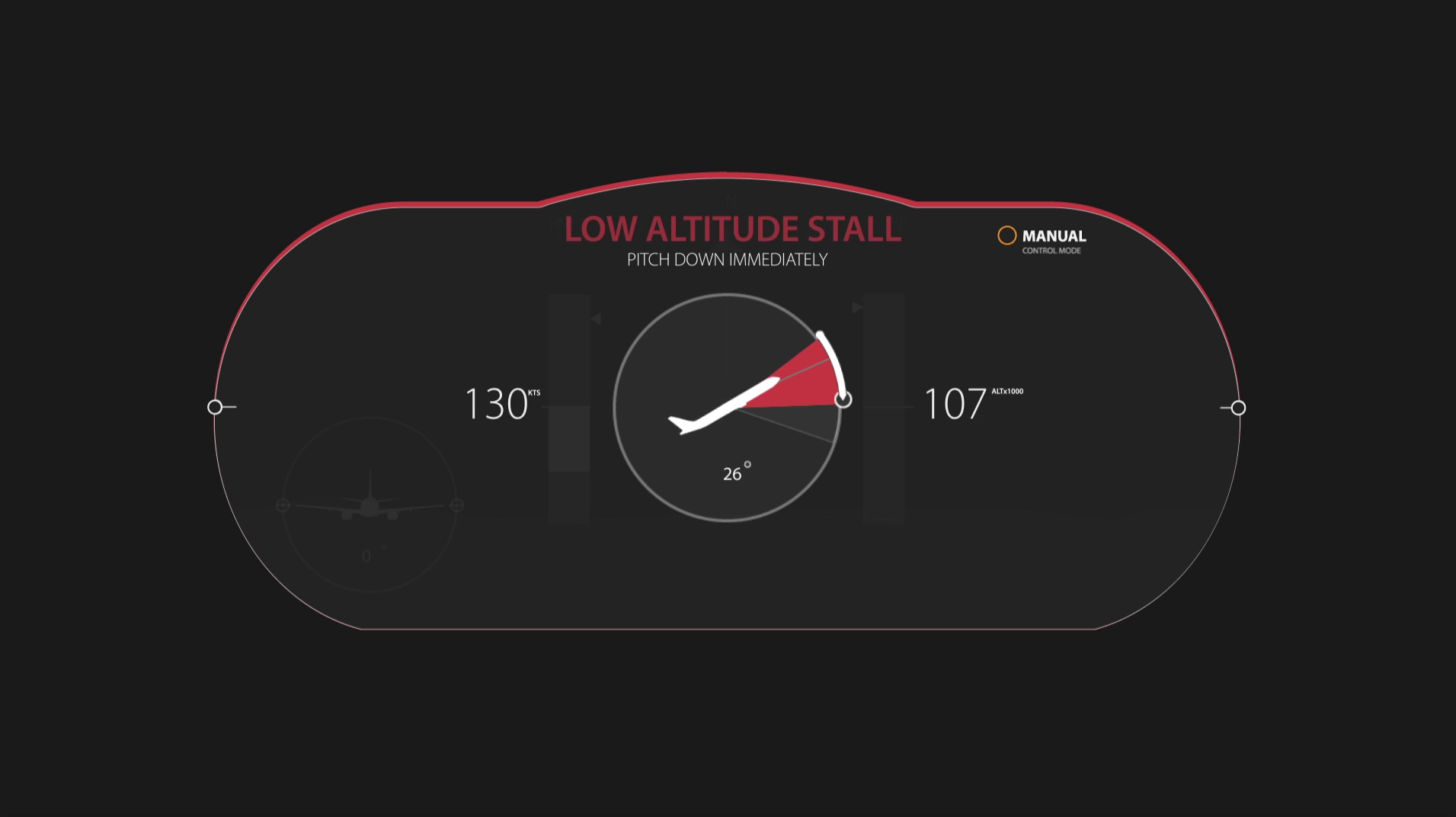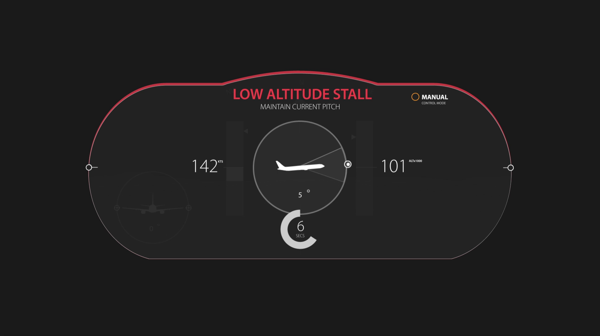 In a stall event, the main interface will change to focus the pilot's attention on pitch and power, two flight mechanics necessary to recover from a stall.